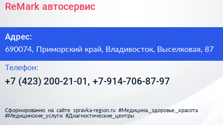 ReMark, автосервис по адресу 690074, Приморский край, Владивосток, Выселковая, 87 в дальнейшем Организация, размещена в следующих категориях: