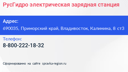 РусГидро, электрическая зарядная станция по адресу 690035, Приморский край, Владивосток, Калинина, 8 ст3 в дальнейшем Организация, размещена в следующих категориях: