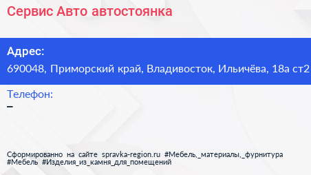 Сервис-Авто, автостоянка по адресу 690048, Приморский край, Владивосток, Ильичёва, 18а ст2 в дальнейшем Организация, размещена в следующих категориях: