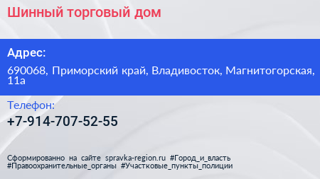 Шинный торговый дом по адресу 690068, Приморский край, Владивосток, Магнитогорская, 11а в дальнейшем Организация, размещена в следующих категориях: