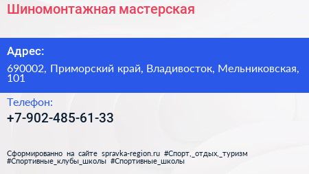 Шиномонтажная мастерская по адресу 690002, Приморский край, Владивосток, Мельниковская, 101 в дальнейшем Организация, размещена в следующих категориях:
