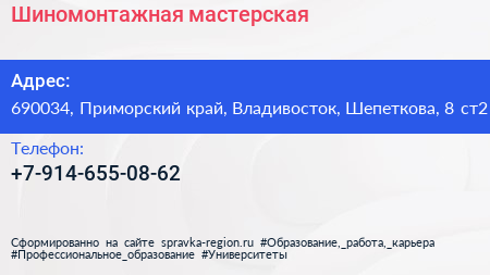 Шиномонтажная мастерская по адресу 690034, Приморский край, Владивосток, Шепеткова, 8 ст2 в дальнейшем Организация, размещена в следующих категориях: