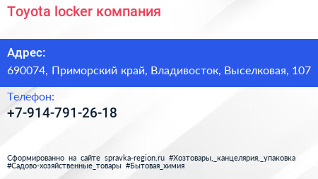 Toyota-locker, компания по адресу 690074, Приморский край, Владивосток, Выселковая, 107 в дальнейшем Организация, размещена в следующих категориях: