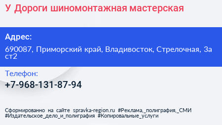 У Дороги, шиномонтажная мастерская по адресу 690087, Приморский край, Владивосток, Стрелочная, 3а ст2 в дальнейшем Организация, размещена в следующих категориях: