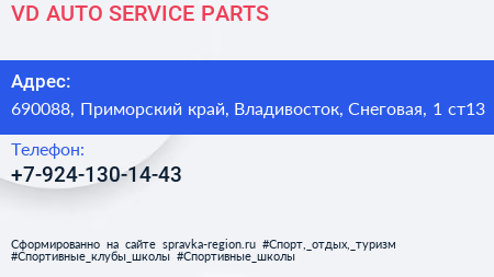 VD AUTO SERVICE & PARTS по адресу 690088, Приморский край, Владивосток, Снеговая, 1 ст13 в дальнейшем Организация, размещена в следующих категориях: