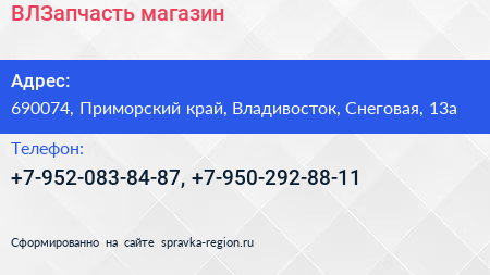 ВЛЗапчасть, магазин по адресу 690074, Приморский край, Владивосток, Снеговая, 13а в дальнейшем Организация, размещена в следующих категориях: