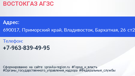 ВОСТОКГАЗ, АГЗС по адресу 690017, Приморский край, Владивосток, Бархатная, 26 ст2 в дальнейшем Организация, размещена в следующих категориях: