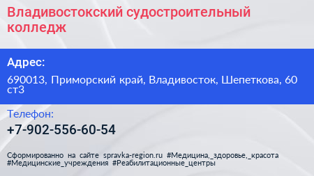 Владивостокский судостроительный колледж по адресу 690013, Приморский край, Владивосток, Шепеткова, 60 ст3 в дальнейшем Организация, размещена в следующих категориях: