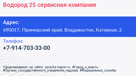 Водород 25, сервисная компания по адресу 690017, Приморский край, Владивосток, Катерная, 2 в дальнейшем Организация, размещена в следующих категориях: