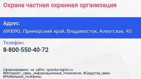 Охрана, частная охранная организация по адресу 690090, Приморский край, Владивосток, Алеутская, 45 в дальнейшем Организация, размещена в следующих категориях: