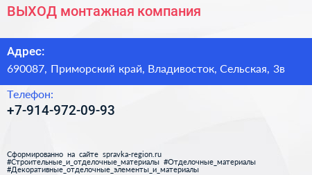 ВЫХОД, монтажная компания по адресу 690087, Приморский край, Владивосток, Сельская, 3в в дальнейшем Организация, размещена в следующих категориях: