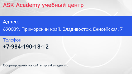 ASK Academy, учебный центр по адресу 690039, Приморский край, Владивосток, Енисейская, 7 в дальнейшем Организация, размещена в следующих категориях: