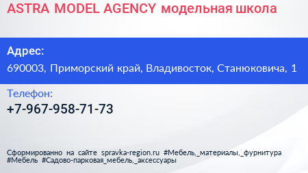 ASTRA MODEL AGENCY, модельная школа по адресу 690003, Приморский край, Владивосток, Станюковича, 1 в дальнейшем Организация, размещена в следующих категориях: