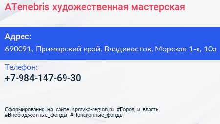 ATenebris, художественная мастерская по адресу 690091, Приморский край, Владивосток, Морская 1-я, 10а в дальнейшем Организация, размещена в следующих категориях: