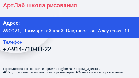 АртЛаб, школа рисования по адресу 690091, Приморский край, Владивосток, Алеутская, 11 в дальнейшем Организация, размещена в следующих категориях: