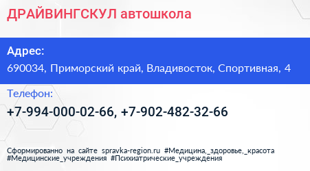 ДРАЙВИНГСКУЛ, автошкола по адресу 690034, Приморский край, Владивосток, Спортивная, 4 в дальнейшем Организация, размещена в следующих категориях: