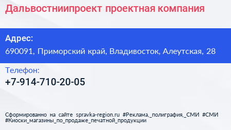 Дальвостниипроект, проектная компания по адресу 690091, Приморский край, Владивосток, Алеутская, 28 в дальнейшем Организация, размещена в следующих категориях: