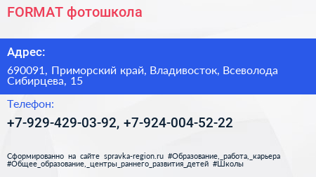 FORMAT, фотошкола по адресу 690091, Приморский край, Владивосток, Всеволода Сибирцева, 15 в дальнейшем Организация, размещена в следующих категориях: