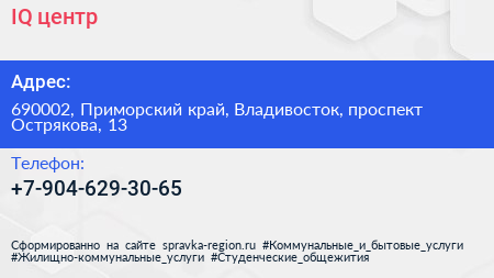 IQ-центр по адресу 690002, Приморский край, Владивосток, проспект Острякова, 13 в дальнейшем Организация, размещена в следующих категориях: