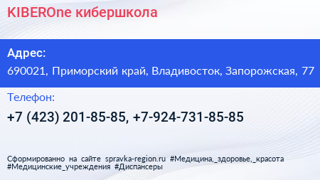 KIBEROne, кибершкола по адресу 690021, Приморский край, Владивосток, Запорожская, 77 в дальнейшем Организация, размещена в следующих категориях: