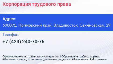 Корпорация трудового права по адресу 690091, Приморский край, Владивосток, Семёновская, 29 в дальнейшем Организация, размещена в следующих категориях: