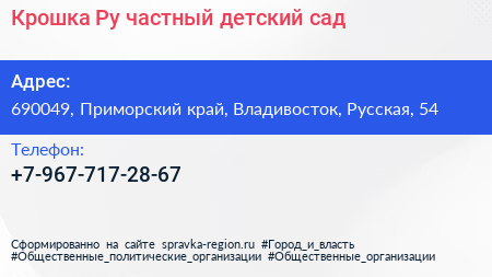 Крошка Ру, частный детский сад по адресу 690049, Приморский край, Владивосток, Русская, 54 в дальнейшем Организация, размещена в следующих категориях: