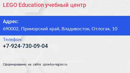 LEGO Education, учебный центр по адресу 690002, Приморский край, Владивосток, Отлогая, 10 в дальнейшем Организация, размещена в следующих категориях: