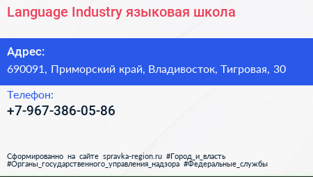 Language Industry, языковая школа по адресу 690091, Приморский край, Владивосток, Тигровая, 30 в дальнейшем Организация, размещена в следующих категориях: