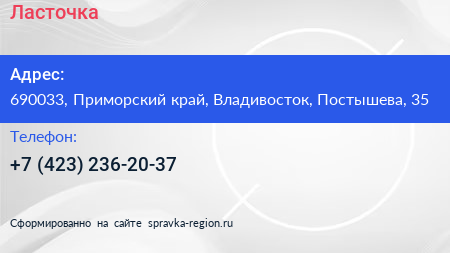 Ласточка по адресу 690033, Приморский край, Владивосток, Постышева, 35 в дальнейшем Организация, размещена в следующих категориях: