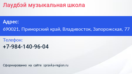 Лаудбэй, музыкальная школа по адресу 690021, Приморский край, Владивосток, Запорожская, 77 в дальнейшем Организация, размещена в следующих категориях: