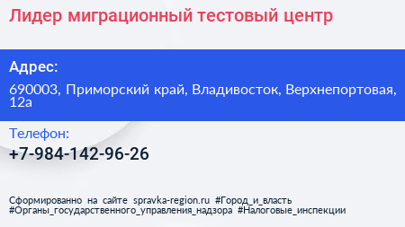 Лидер, миграционный тестовый центр по адресу 690003, Приморский край, Владивосток, Верхнепортовая, 12а в дальнейшем Организация, размещена в следующих категориях: