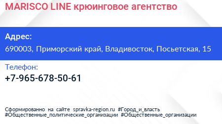 MARISCO LINE, крюинговое агентство по адресу 690003, Приморский край, Владивосток, Посьетская, 15 в дальнейшем Организация, размещена в следующих категориях: