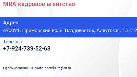 MRA, кадровое агентство по адресу 690091, Приморский край, Владивосток, Алеутская, 15 ст2 в дальнейшем Организация, размещена в следующих категориях: