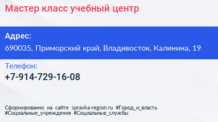Мастер класс, учебный центр по адресу 690035, Приморский край, Владивосток, Калинина, 19 в дальнейшем Организация, размещена в следующих категориях: