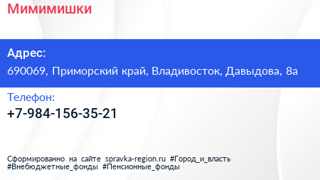 Мимимишки по адресу 690069, Приморский край, Владивосток, Давыдова, 8а в дальнейшем Организация, размещена в следующих категориях: