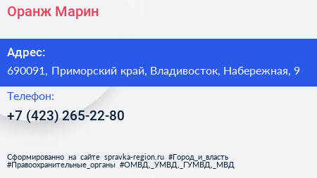 Оранж Марин по адресу 690091, Приморский край, Владивосток, Набережная, 9 в дальнейшем Организация, размещена в следующих категориях: