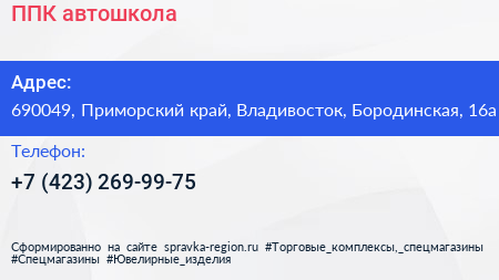 ППК, автошкола по адресу 690049, Приморский край, Владивосток, Бородинская, 16а в дальнейшем Организация, размещена в следующих категориях: