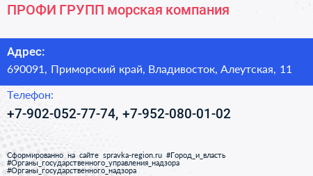 ПРОФИ ГРУПП, морская компания по адресу 690091, Приморский край, Владивосток, Алеутская, 11 в дальнейшем Организация, размещена в следующих категориях: