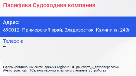 Пасифика, Судоходная компания по адресу 690012, Приморский край, Владивосток, Калинина, 243г в дальнейшем Организация, размещена в следующих категориях:
