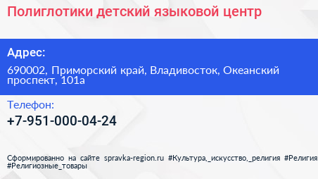 Полиглотики, детский языковой центр по адресу 690002, Приморский край, Владивосток, Океанский проспект, 101а в дальнейшем Организация, размещена в следующих категориях: