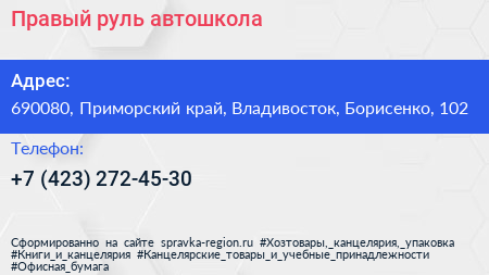 Правый руль, автошкола по адресу 690080, Приморский край, Владивосток, Борисенко, 102 в дальнейшем Организация, размещена в следующих категориях: