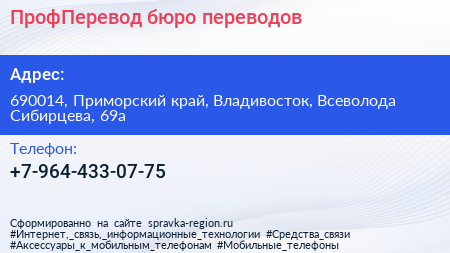 ПрофПеревод, бюро переводов по адресу 690014, Приморский край, Владивосток, Всеволода Сибирцева, 69а в дальнейшем Организация, размещена в следующих категориях: