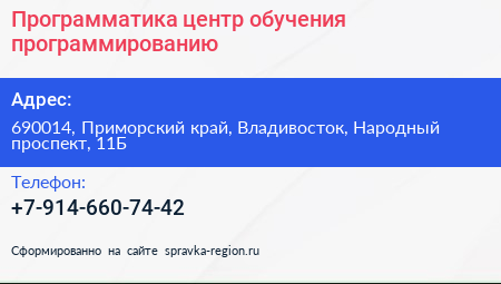 Программатика, центр обучения программированию по адресу 690014, Приморский край, Владивосток, Народный проспект, 11Б в дальнейшем Организация, размещена в следующих категориях: