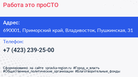 Работа-это проСТО по адресу 690001, Приморский край, Владивосток, Пушкинская, 31 в дальнейшем Организация, размещена в следующих категориях:
