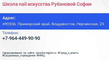 Школа nail-искусства Рубановой Софии по адресу 690106, Приморский край, Владивосток, Нерчинская, 23 в дальнейшем Организация, размещена в следующих категориях: