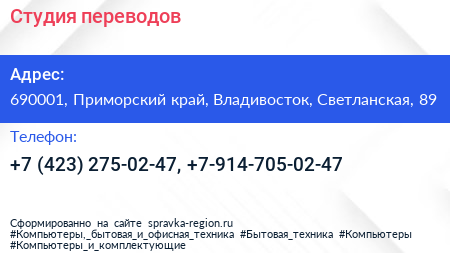 Студия переводов по адресу 690001, Приморский край, Владивосток, Светланская, 89 в дальнейшем Организация, размещена в следующих категориях:
