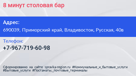 8 минут, столовая-бар по адресу 690039, Приморский край, Владивосток, Русская, 40в в дальнейшем Организация, размещена в следующих категориях: