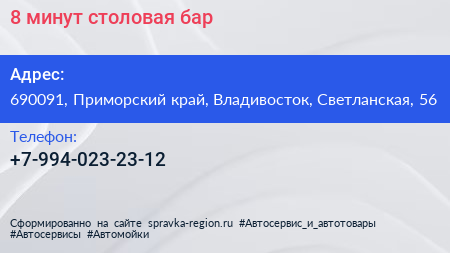8 минут, столовая-бар по адресу 690091, Приморский край, Владивосток, Светланская, 56 в дальнейшем Организация, размещена в следующих категориях: