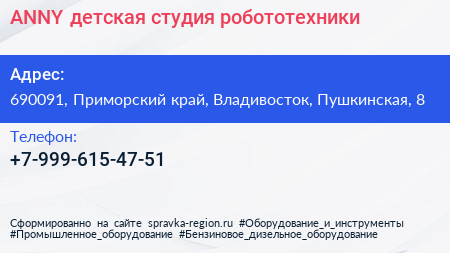 ANNY, детская студия робототехники по адресу 690091, Приморский край, Владивосток, Пушкинская, 8 в дальнейшем Организация, размещена в следующих категориях: