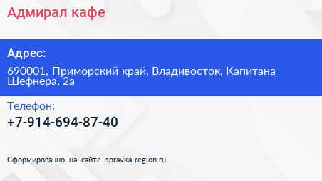 Адмирал, кафе по адресу 690001, Приморский край, Владивосток, Капитана Шефнера, 2а в дальнейшем Организация, размещена в следующих категориях: